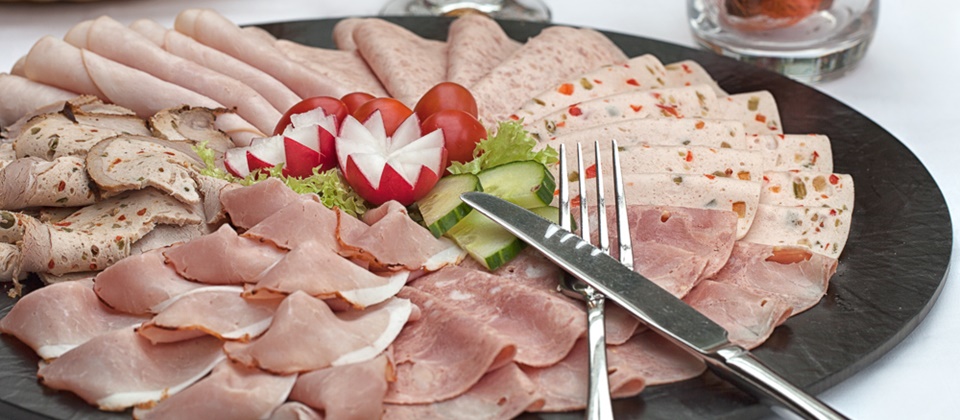 Verschiedene Sorten Wurst und Käse, Gemüse, Obst - Normales Frühstück Klein